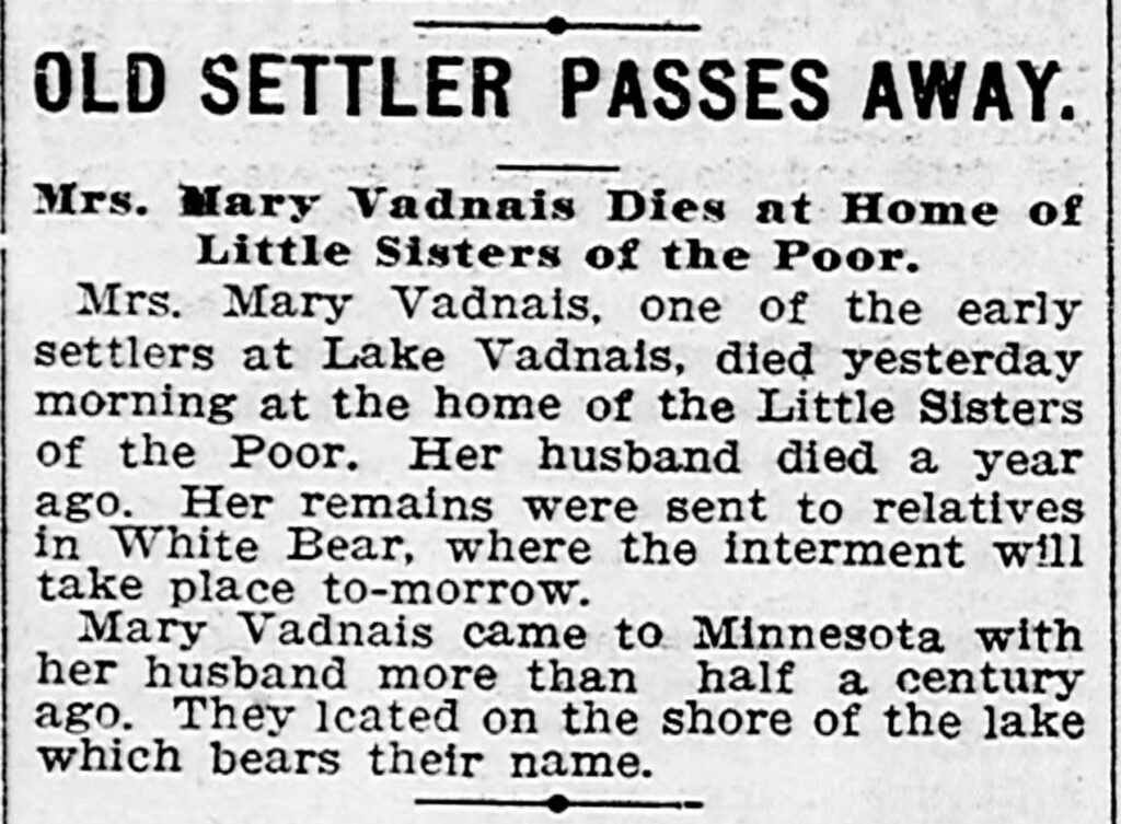 While doing a newspaper search for “Vadnais,” all that I saw in regard to this article was “Mrs. Mary Vadnais Dies at Home.” I think that I passed by it at least 3 times because I thought I didn’t know the person. The next time it came up, I mumbled to myself (I talk to myself quite frequently) that I should at least give it a look. I’m glad I did!