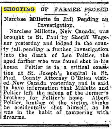 After reading the story, I was fairly sure that 2 of the 3 people were relatives: Albert Peltier (my great-grandfather) and Leon Peltier (my great-granduncle); I was unable to determine anything about Narcisse Milllette. At first I was confused by the story because in the beginning the writer stated that Leon was dead, but my great-granduncle Leon didn’t die until 1947 when he was 86 years old. However, things were cleared up in the next sentence where, as quickly as he passed away, Leon was now in critical condition at St. Joseph’s hospital. At the time of the story, Leon was 52 years old.